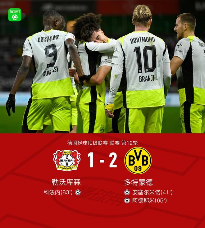 北京時(shí)間11月30日1:30,德甲第12輪繼續(xù)進(jìn)行,勒沃庫(kù)森坐鎮(zhèn)拜耳競(jìng)技場(chǎng)迎戰(zhàn)多特蒙德,本場(chǎng)主裁判為托比亞斯-韋爾茨。上半場(chǎng),安塞爾米諾力壓防守頭槌破門(mén)。下半場(chǎng),法比奧-席爾瓦助攻阿德耶米頭球建功,科法內(nèi)為勒沃庫(kù)森扳回一城。最終,多特2-1客勝勒沃庫(kù)森。