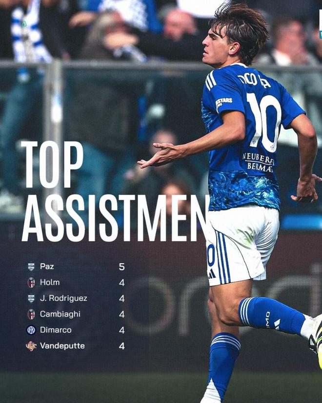 意甲開賽至今,尼科-帕斯打滿13場(chǎng)比賽,送出5球5助攻,在射手榜并列首位,在助攻榜獨(dú)占榜首,是賽季首位直接參與10粒進(jìn)球的意甲球員。