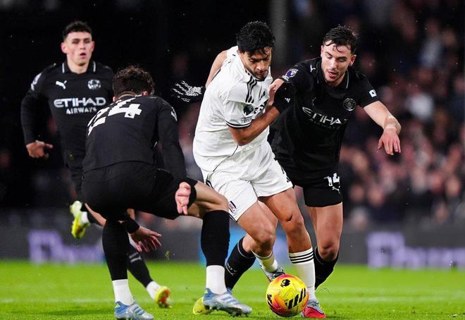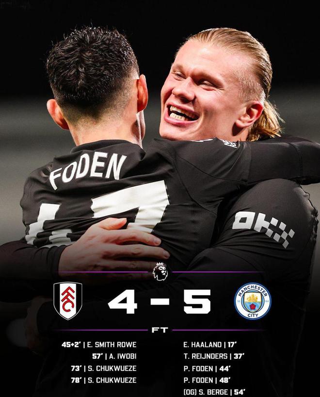 易邊再戰(zhàn)不到3分鐘,曼城又打出一波精妙反擊:第48分鐘,福登梅開二度,比分4-1;隨后,多庫的內(nèi)切兜射折射破門,5-1。正常情況下,比賽應(yīng)該就此終止懸念。然而富勒姆忽然打出血性,用21分鐘連扳三球,幾乎完成史詩級(jí)逆轉(zhuǎn):第57分鐘:伊沃比兜射破門,5-2;第73分鐘:丘庫埃澤抽射進(jìn)球,5-3;第78分鐘:丘庫埃澤復(fù)制進(jìn)球,梅開二度,5-4!曼城從5-1到5-4,后防連續(xù)斷電,險(xiǎn)些成為本賽季最大的笑柄。本場(chǎng)9球,是本賽季英超單場(chǎng)進(jìn)球最多的比賽。